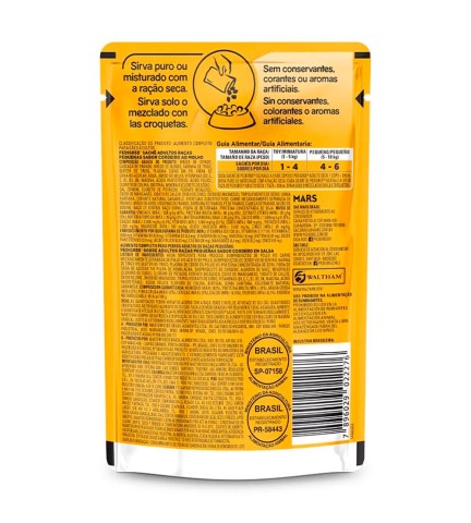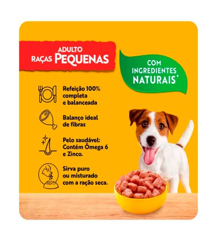 Ração Úmida Cães Adultos é um delicioso sachê PEDIGREE, um alimento 100% completo e balanceado. Elaborado com Vitamina E para fortalecer o sistema imunológico e ingredientes de alta qualidade para garantir a felicidade e a saúde do seu cão. Livre de conservantes, sabores e aromas artificiais. A ração úmida Pedigree oferece uma nutrição 100% completa e balanceada, com Vitamina E para promover uma vida saudável e um balanço ideal de fibras. Modo de usar: Cães de 1kg a 5kg: 1 a 4 sachês por dia Cães de 5kg a 10 kg: 4 a 6 sachês por dia Ingredientes: Miúdo de ovino, carcaça de frango, miúdo de suíno, farinha de trigo, glúten de trigo, plasma suíno em pó, fibra de cana-de-açúcar, água, amido de milho, tripolifosfato de sódio, goma xantana, corante natural caramelo. Eventuais substitutivos: Carne mecanicamente separada de frango, miúdo de ave, vísceras de frango, gordura de frango, pé de frango, cabeça de frango, miúdo de bovino, baço de bovino, baço suíno, polpa de beterraba, proteína concentrada de soja. D3, E, C, B1, B2, B6, niacina, ácido pantotênico, ácido fólico, cloreto de colina, biotina Cloreto de sódio – sal comum, cloreto de potássio, fosfato bicálcico, óxido de manganês, iodato de cálcio, óxido de zinco, óxido de magnésio.